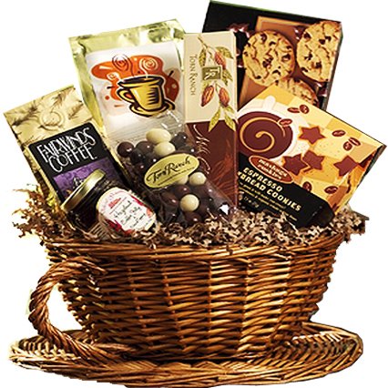 Know a special someone who just cant live without their coffee? Give them a real eye-opener with this clever, giant coffee cup filled to overflowing with an assortment of premium coffee and carefully selected gourmet companions to nibble & dunk along with it. Your great gift includes a selection of premium French Vanilla Coffee and Almond Fudge Coffee along with Milk Chocolate Cappucino Bar, Dark & White Chocolate Espresso Beans, Espresso Shortbread Cookies, Hazelnut Coffee Jelly and Chocolate Chip Cookies. Each gift is carefully hand packed with attention to detail and includes a personalized gift message from you to convey your best wishes on any gift occasion.