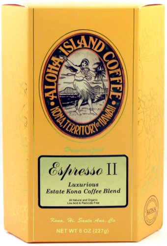 Our long awaited GOLD ESPRESSO II coffee. You loved our Gold Espresso coffee and now you will fall in love with our new and exquisite GOLD ESPRESSO II profile. (8 oz Whole Bean)We know our customers want value as well as quality and so we have worked painstakingly to create this new, exciting, and value-priced selection that we have named GOLD ESPRESSO II. Our Gold Espresso II is an extraordinary blend of our 100% Pure Kona Coffee and our hand selected estate tropical coffee. We have lovingly blended the best of the tropics by marrying our Pure Kona Coffee to the absolute best tropical coffee on earth. Roasted to perfection, and with the greatest of care, to a very rich, deep, dark, espresso roast, this coffee retains the smooth texture and rich, depth of flavor that you expect from Aloha Island Coffee products. Gold Espresso II is smooth, rich, full-bodied and aromatic and is perfect as a rich, dark brewed coffee, or for your espresso needs.Savor this fine coffee selection. It will enhance your life and broaden your coffee enjoyment and pleasure. Read more...
